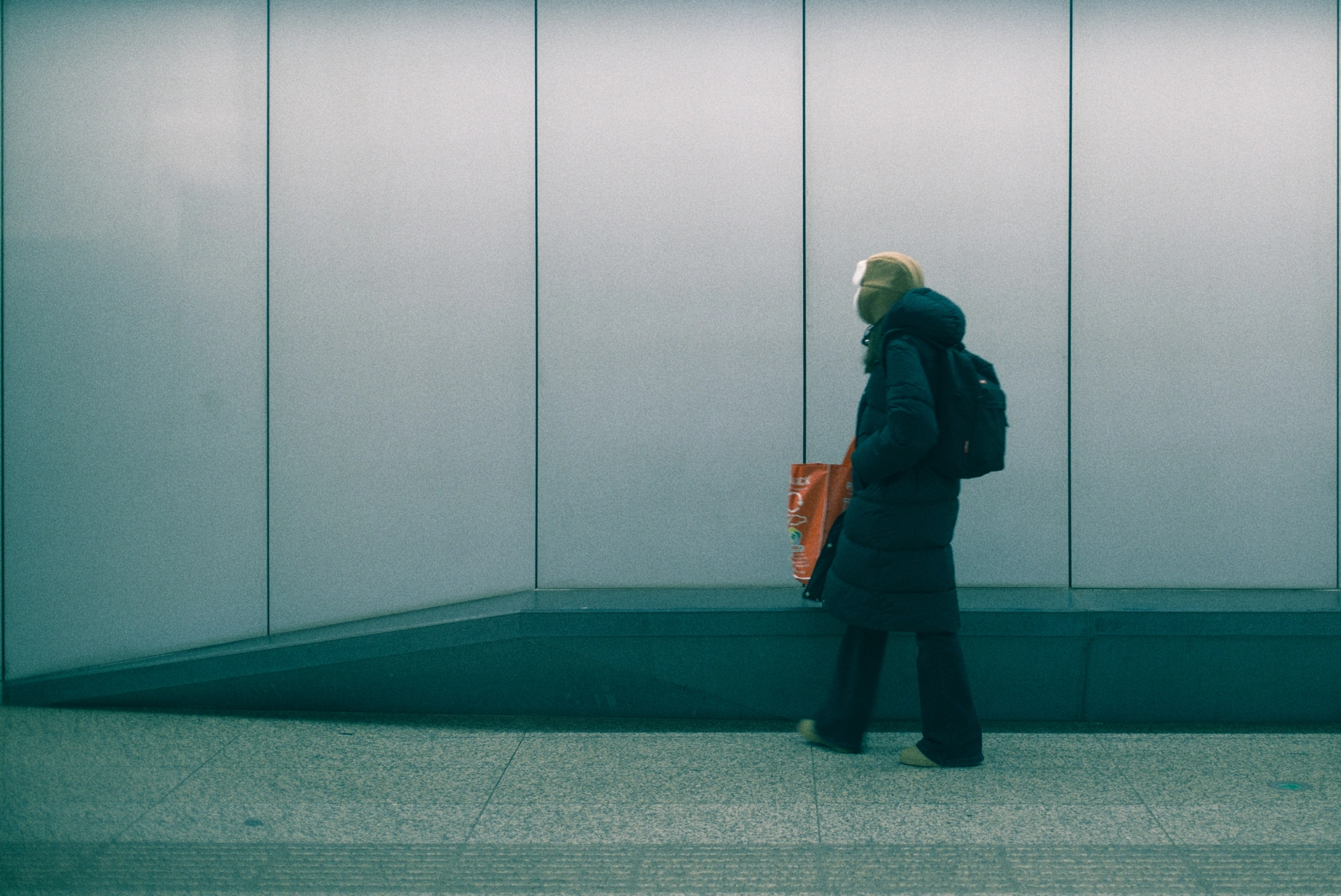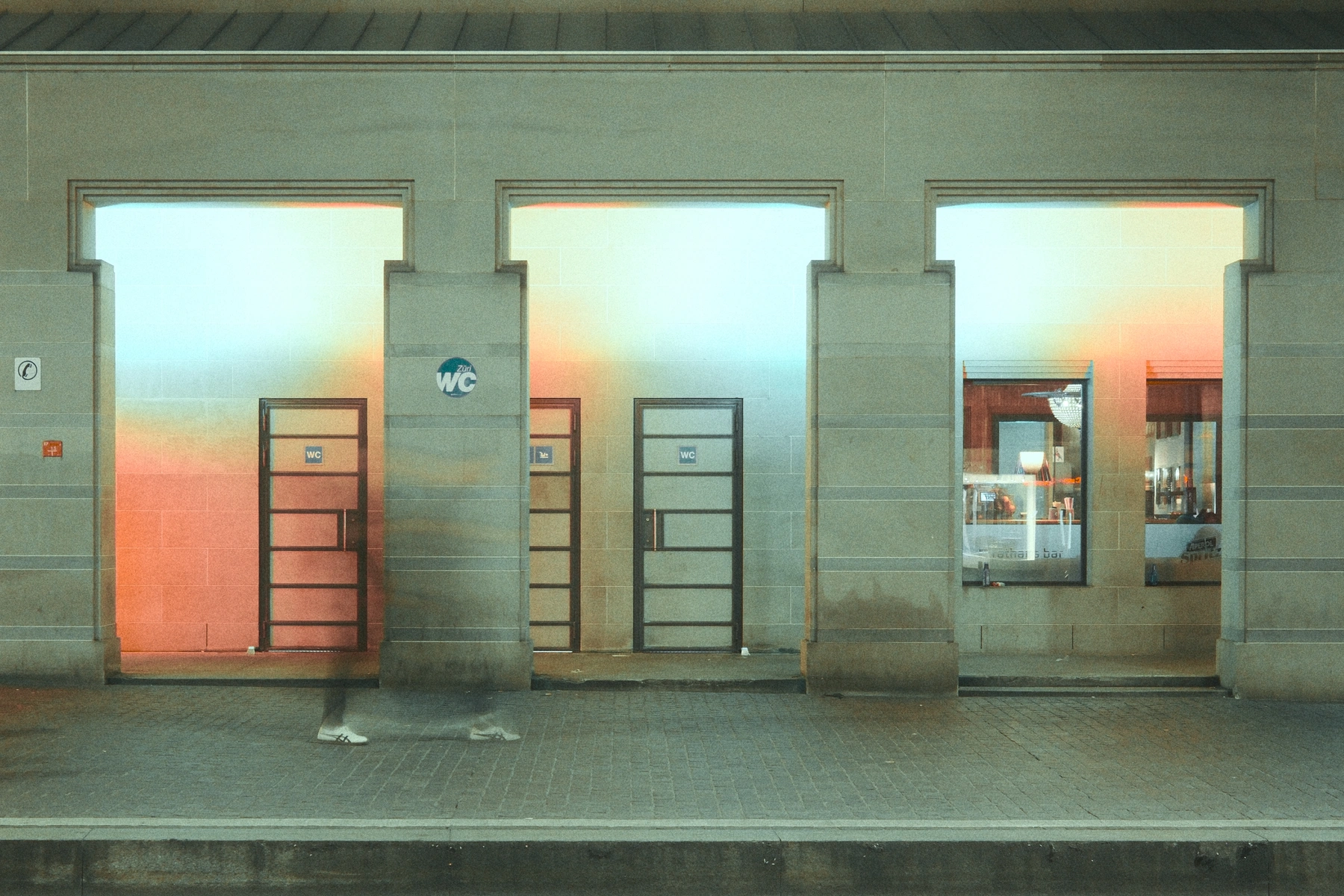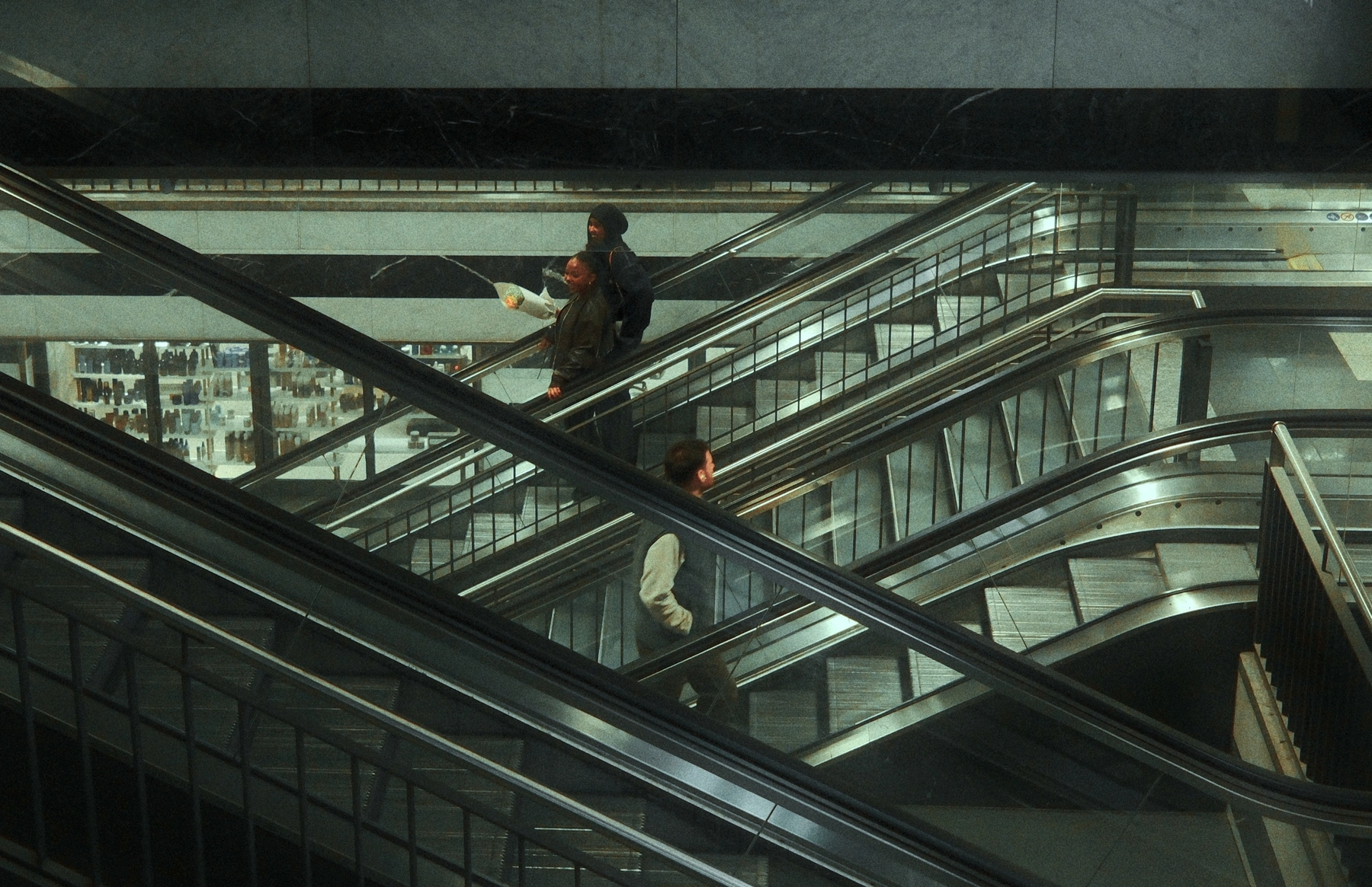 Bilder aus den Transiträumen der Stadt. Architektur strukturiert den Blick: Säulen, Raster, Glas. Der Raum ordnet; die Figuren darin werden Teil des Gefüges.